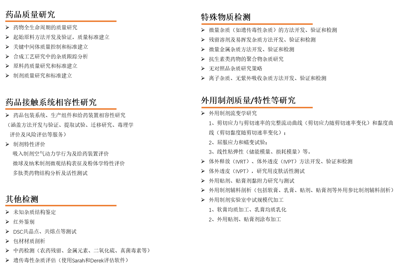 基于公司(集團)先進的檢測設備和完善的質量管理體系,能夠幫助項目組完成復雜化合物檢測方法的開發(fā)、相容性研究(包材、給藥裝置、生產組件等)及特殊雜質的檢測(元素雜質、遺傳毒雜質、金屬離子、聚合物等)。