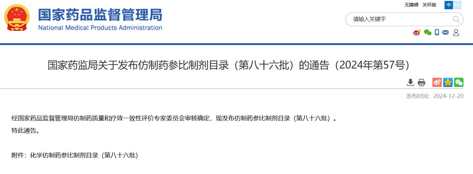 國家藥監局關于發布仿制藥參比制劑目錄(第八十六批)的通告(2024年第57號)
