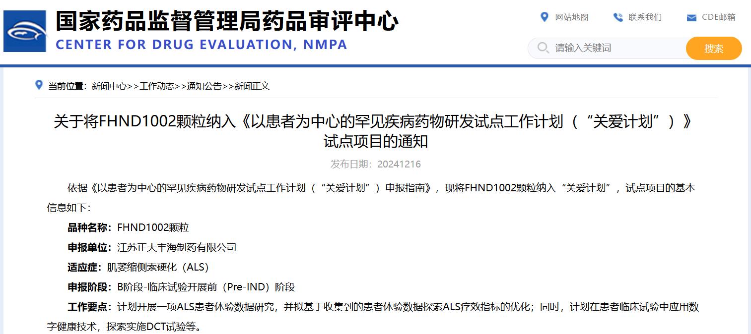 關于將FHND1002顆粒納入《以患者為中心的罕見疾病藥物研發試點工作計劃(“關愛計劃”)》試點項目的通知