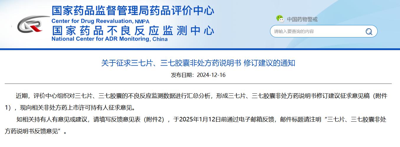 關于征求三七片、三七膠囊非處方藥說明書修訂建議的通知