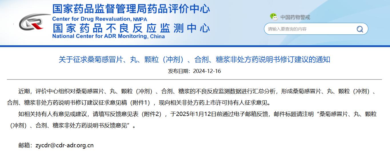 關于征求桑菊感冒片、丸、顆粒(沖劑)、合劑、糖漿非處方藥說明書修訂建議的通知