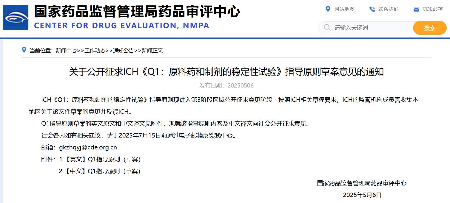 關(guān)于公開征求ICH《Q1:原料藥和制劑的穩(wěn)定性試驗(yàn)》指導(dǎo)原則草案意見的通知