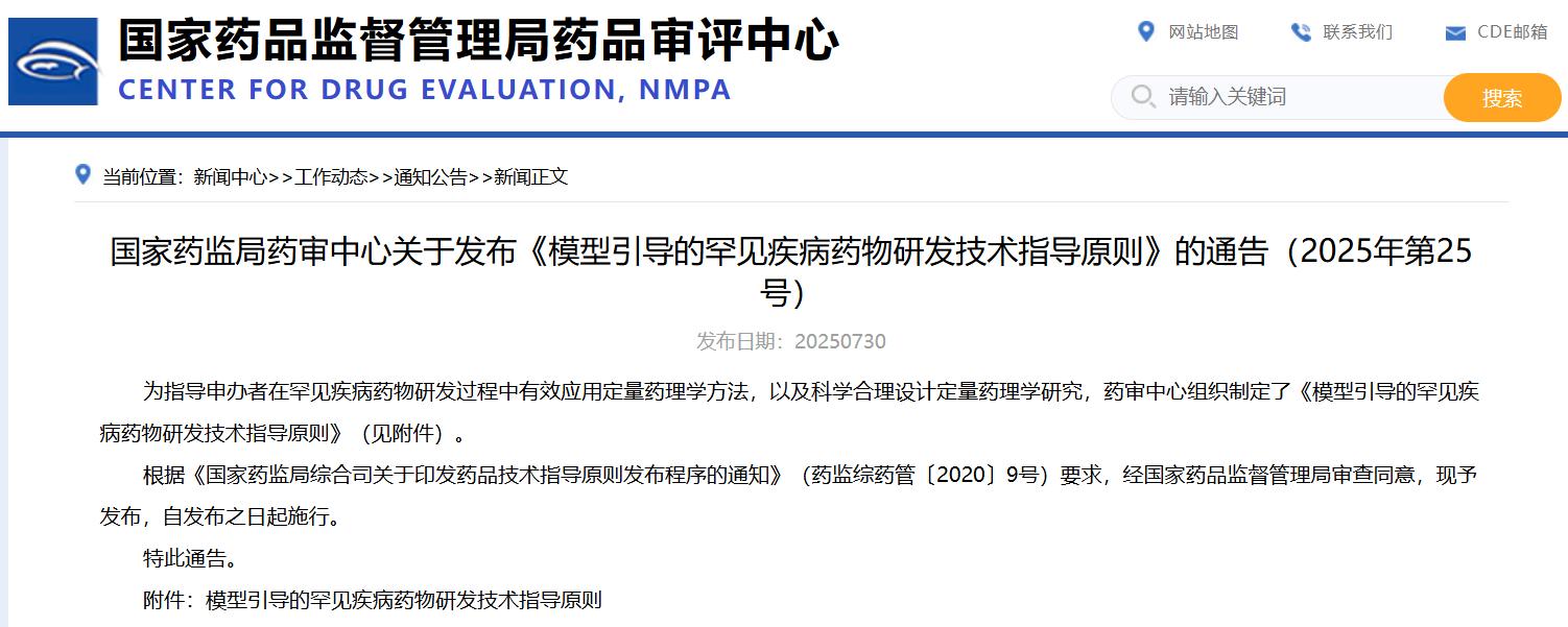 國家藥監局藥審中心關于發布《模型引導的罕見疾病藥物研發技術指導原則》的通告(2025年第25號)