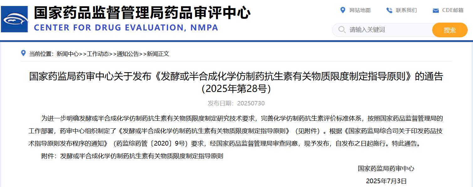 國家藥監局藥審中心關于發布《發酵或半合成化學仿制藥抗生素有關物質限度制定指導原則》的通告(2025年第28號)