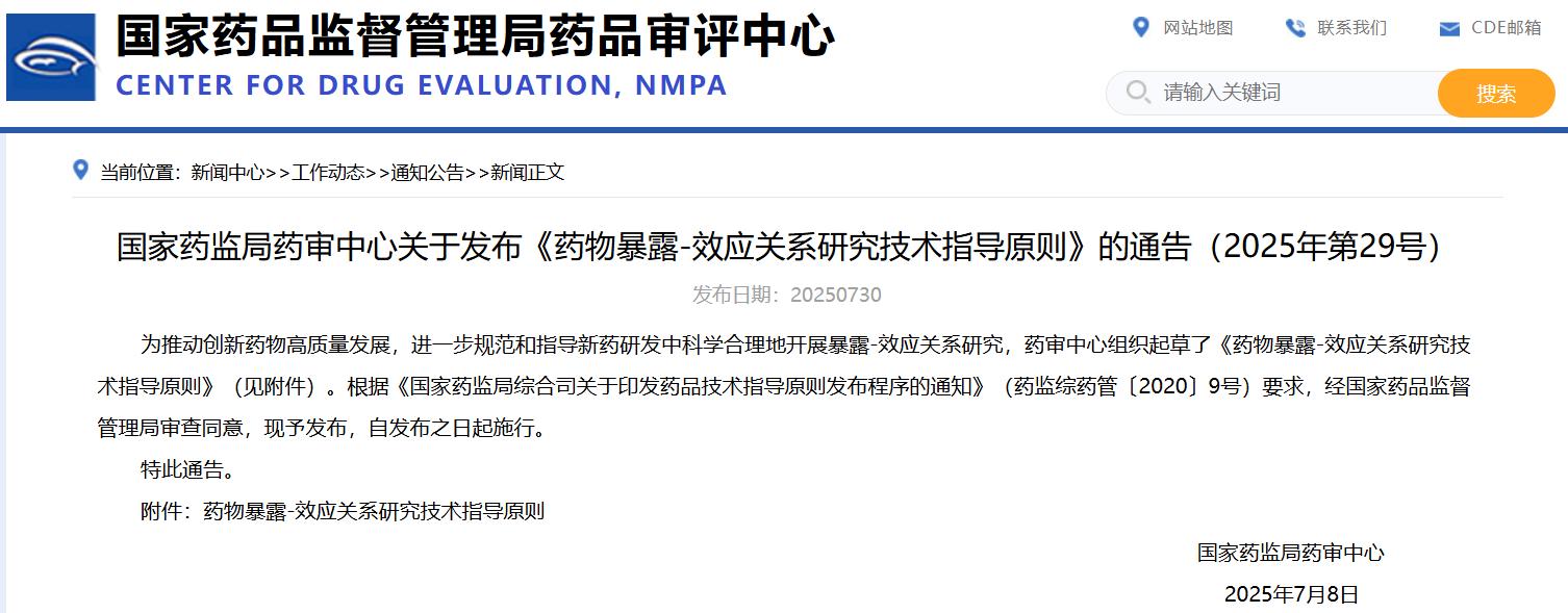 國家藥監局藥審中心關于發布《藥物暴露-效應關系研究技術指導原則》的通告(2025年第29號)