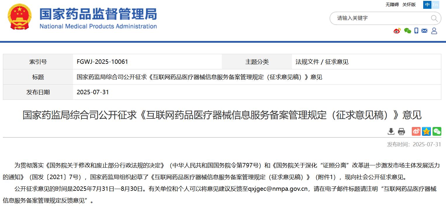 國家藥監局綜合司公開征求《互聯網藥品醫療器械信息服務備案管理規定(征求意見稿)》意見