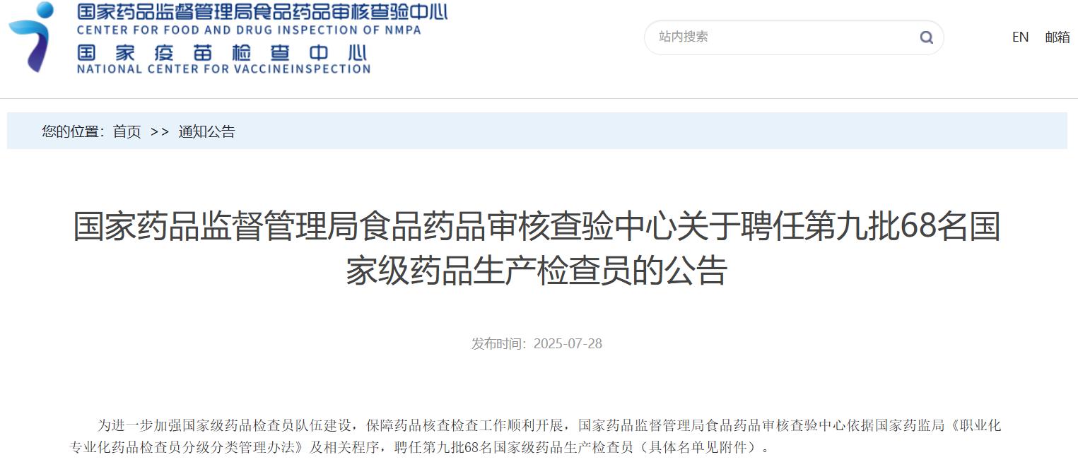 國家藥品監督管理局食品藥品審核查驗中心關于聘任第九批68名國家級藥品生產檢查員的公告