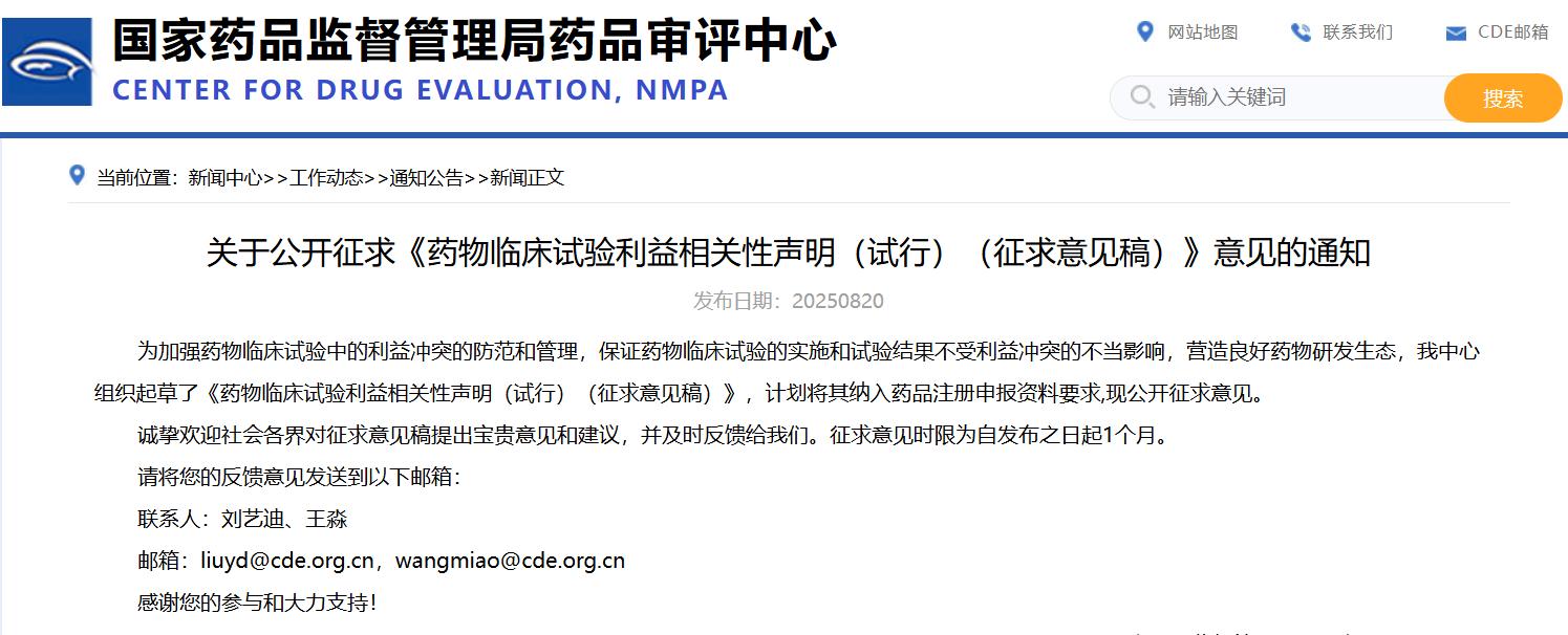 關(guān)于公開征求《藥物臨床試驗(yàn)利益相關(guān)性聲明(試行)(征求意見稿)》意見的通知