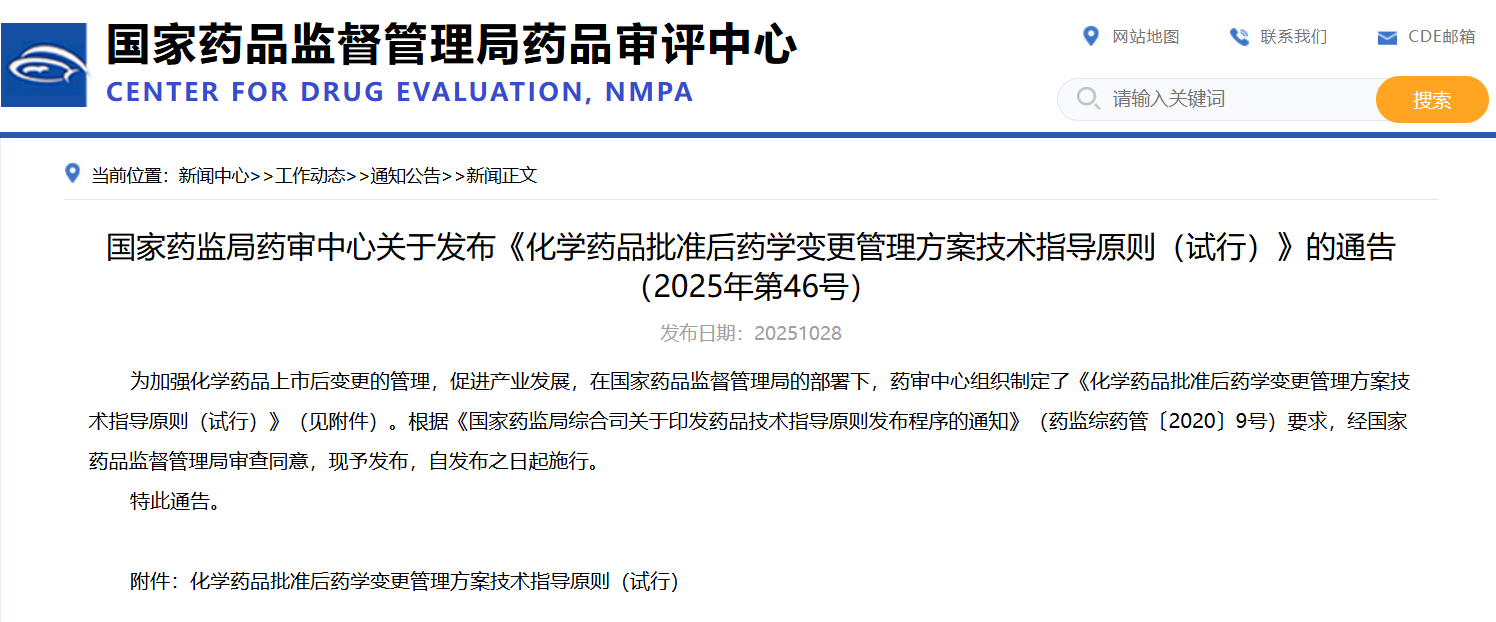 國家藥監局藥審中心關于發布《化學藥品批準后藥學變更管理方案技術指導原則(試行)》的通告(2025年第46號)