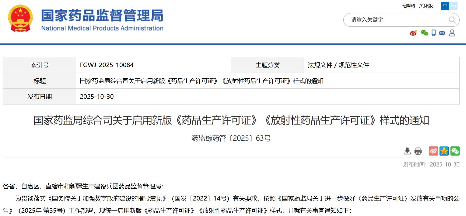 國家藥監局綜合司關于啟用新版《藥品生產許可證》《放射性藥品生產許可證》樣式的通知