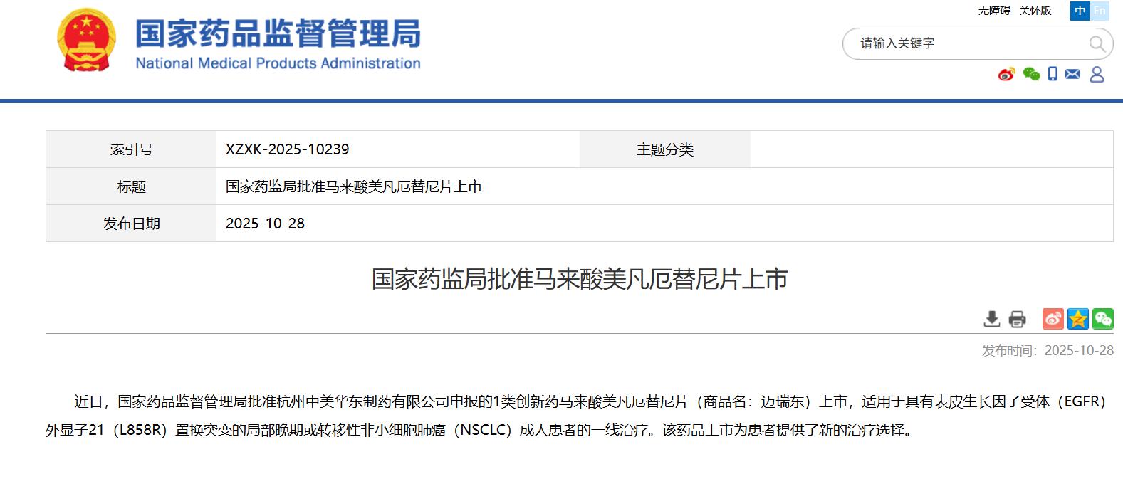 國家藥監局批準馬來酸美凡厄替尼片上市