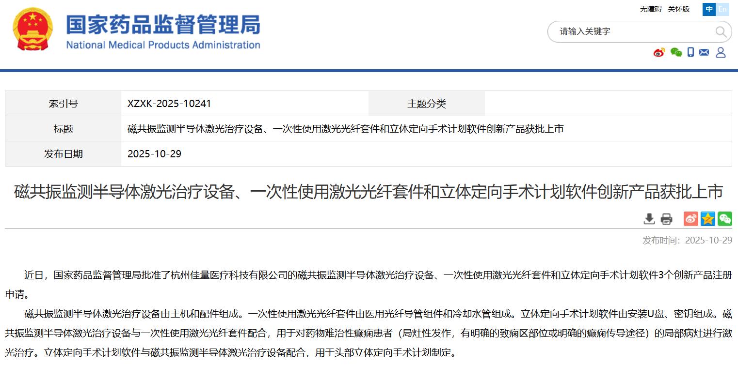 磁共振監測半導體激光治療設備、一次性使用激光光纖套件和立體定向手術計劃軟件創新產品獲批上市