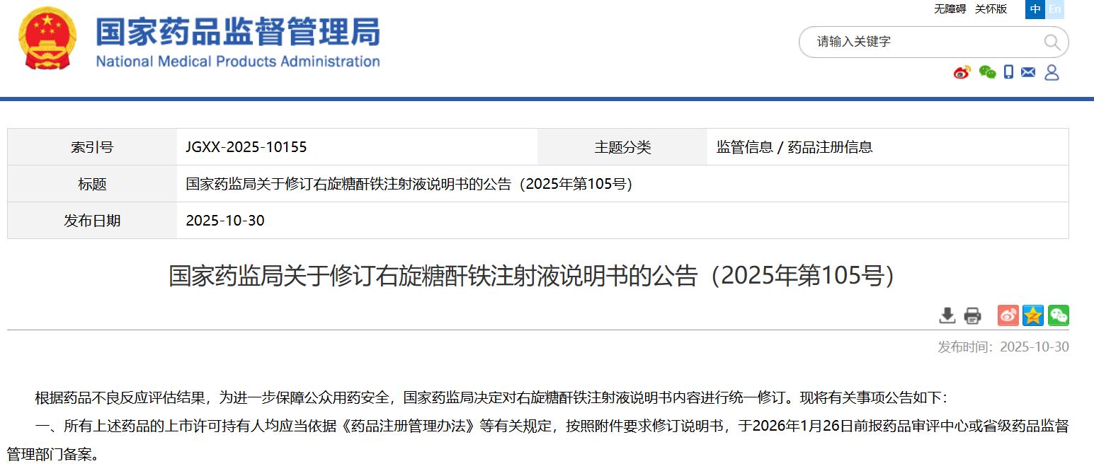 國家藥監局關于修訂右旋糖酐鐵注射液說明書的公告(2025年第105號)
