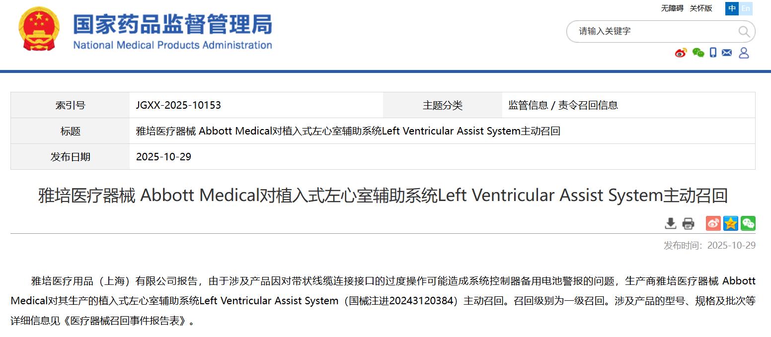 雅培醫療器械 Abbott Medical對植入式左心室輔助系統Left Ventricular Assist System主動召回