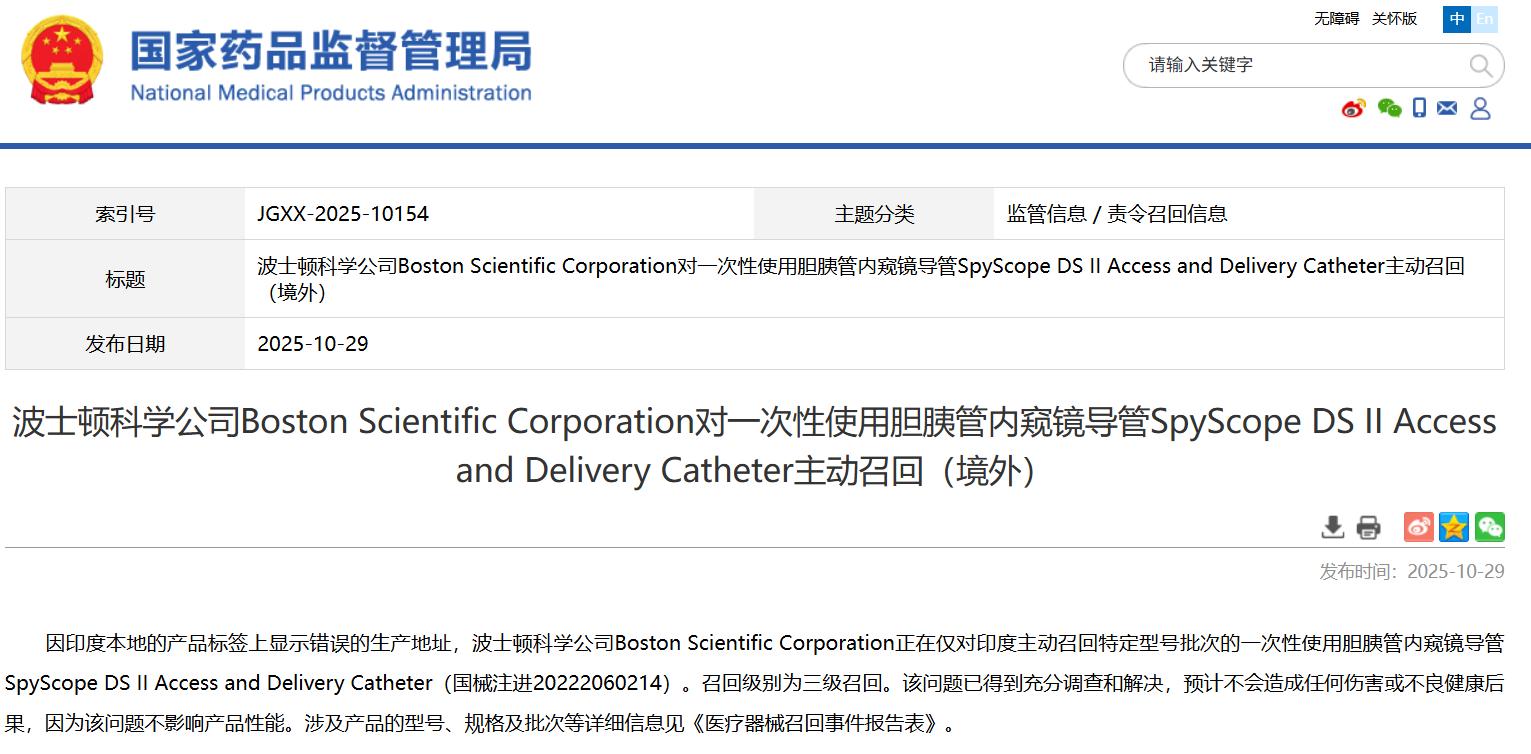 波士頓科學公司Boston Scientific Corporation對一次性使用膽胰管內窺鏡導管SpyScope DS II Access and Delivery Catheter主動召回(境外)