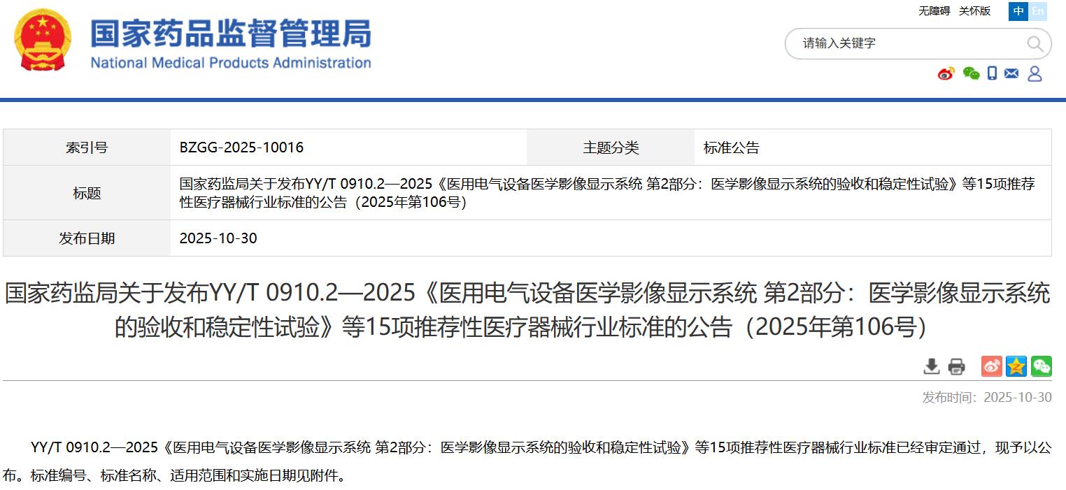 國家藥監局關于發布YY/T 0910.2—2025《醫用電氣設備醫學影像顯示系統 第2部分:醫學影像顯示系統的驗收和穩定性試驗》等15項推薦性醫療器械行業標準的公告(2025年第106號)