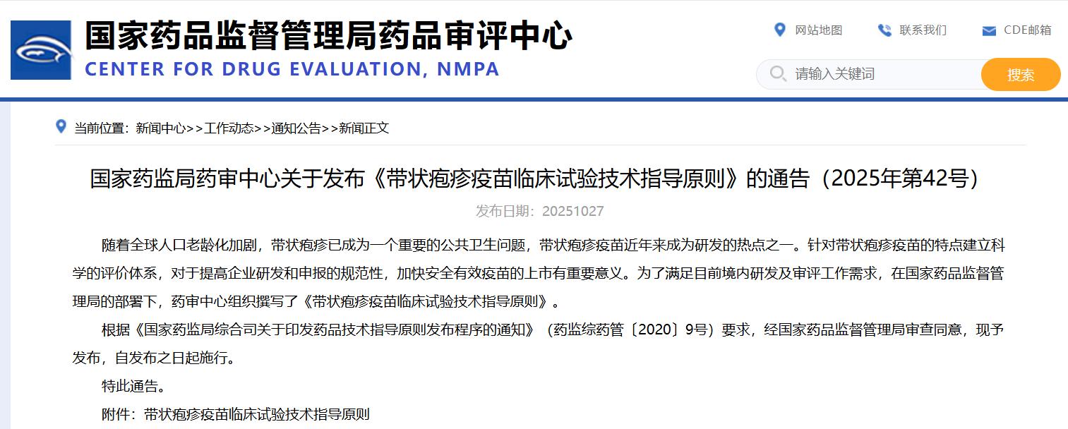 國家藥監局藥審中心關于發布《帶狀皰疹疫苗臨床試驗技術指導原則》的通告(2025年第42號)
