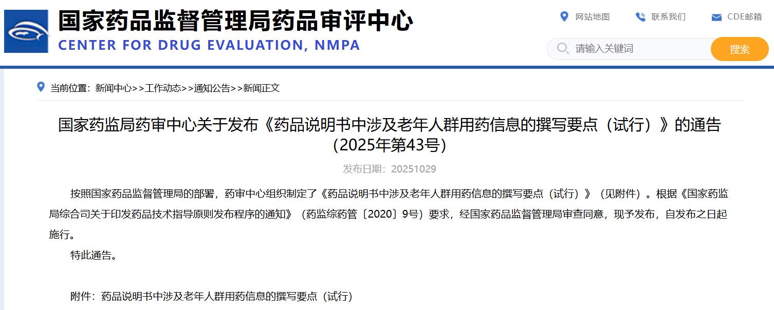 國家藥監局藥審中心關于發布《藥品說明書中涉及老年人群用藥信息的撰寫要點(試行)》的通告(2025年第43號)