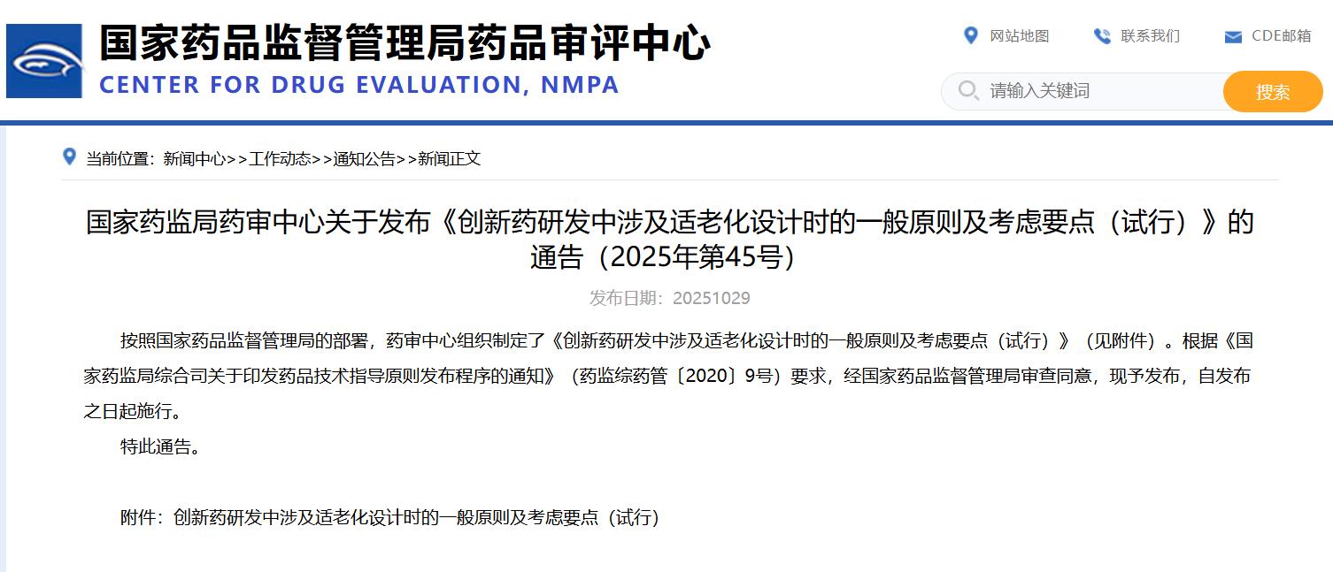 國家藥監局藥審中心關于發布《創新藥研發中涉及適老化設計時的一般原則及考慮要點(試行)》的通告(2025年第45號)