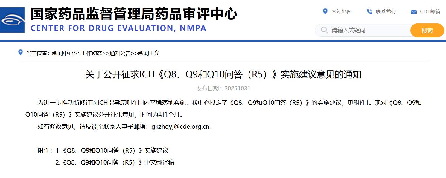 關于公開征求ICH《Q8、Q9和Q10問答(R5)》實施建議意見的通知