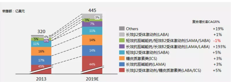 在市場方面,IQVIA報告顯示,2019年全球吸入制劑的市場份額高達480億美元,6年復合增長率為+6.99%。全球吸入制劑藥物的應用場景,主要來自支氣管哮喘Asthma/慢阻肺COPD的防治(約93%市場份額)、肺動脈高壓治療,以及吸入麻醉及咳嗽的運用。