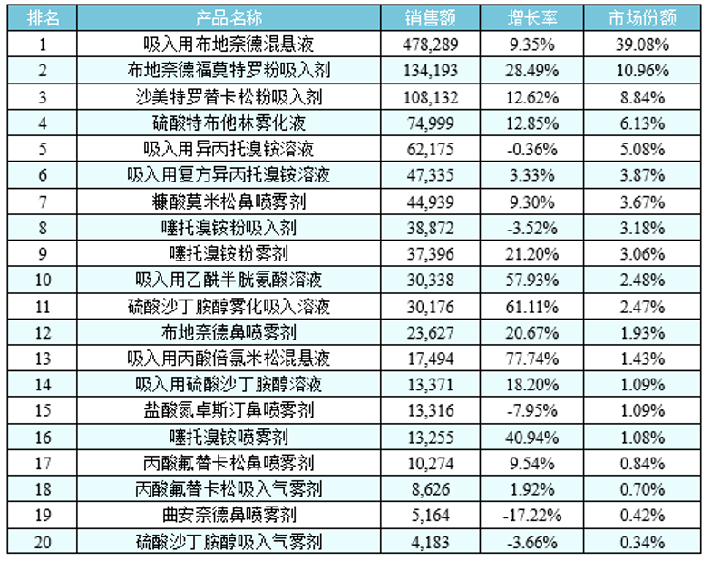在劑型細分領域,IQVIA分析報告顯示,全球各劑型處方量中氣霧劑占55%,粉霧劑占35%,霧化溶液占10%;銷售金額中,氣霧劑占32%,粉霧劑占46%,霧化溶液占22%,可見全球氣霧劑的銷售量最大,而粉霧劑的銷售金額最大,主要原因為氣霧、粉霧劑型的市場先發優勢。
