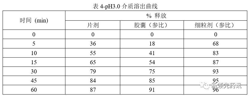 述溶出曲線表明,片劑和膠囊劑溶出行為相似。但在pH3.0介質中,片劑的溶出行為較膠囊劑偏快,在pH6.8介質中,片劑、膠囊劑和細粒劑均為快速溶出。細粒劑在各個pH條件下,均有較快的溶出行為,與其處方組成設計有關。