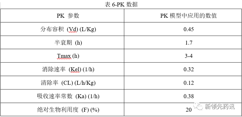 根據上述各組織酶和轉運蛋白的預測參數,設定藥代動力學參數。將文獻中PK數據進行提取,基于房室模型預測的藥代動力學,得到以下數據,如下表: