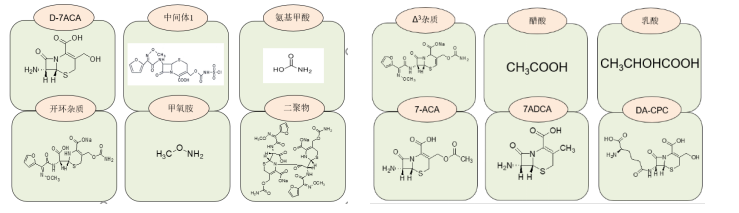 我們根據(jù)原料藥的生產(chǎn)工藝及β-內(nèi)酰胺類(lèi)抗生素的特點(diǎn),重點(diǎn)研究了以下雜質(zhì):