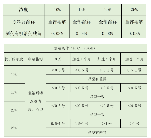 結(jié)論:試驗(yàn)結(jié)果表明,輔料叔丁醇的濃度對(duì)制劑的有機(jī)溶劑殘留沒(méi)有明顯影響,但是對(duì)溶液的澄清度和復(fù)溶后原料的晶型有較為明顯的影響。最終確定15%和20%的輔料濃度是比較合適的。