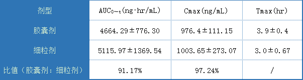 從日本IF文件中,并沒有直接獲得膠囊劑和細粒劑的藥動學參數對比,但我們從日本某公司的仿制藥IF文件中,可分別獲得仿制的膠囊與原研膠囊的藥動學對比,以及仿制的細粒劑與原研細粒劑的藥動學對比,具體如下: