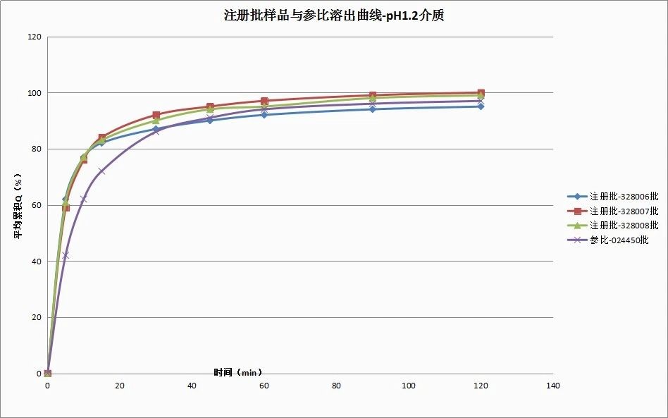本品種仿制藥開發的過程,經過逐級放大,工藝驗證三批樣品在pH1.2介質中的溶出略快于BE批次的參比制劑,三批樣品與參比的相似因子均未達到50,曲線圖如下: