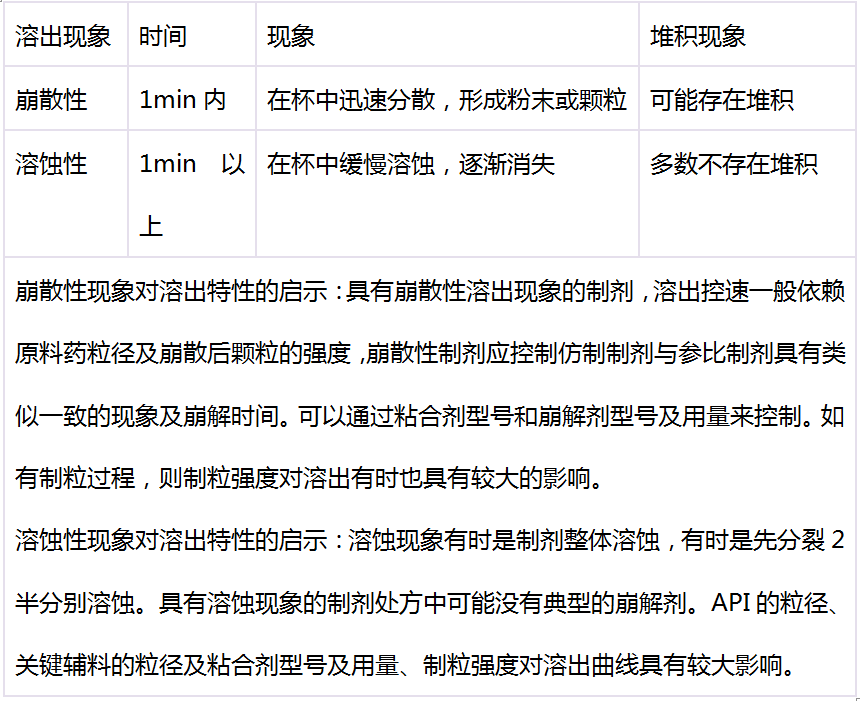 參比制劑溶出現象及溶出數據的解讀,在參比制劑溶出特性剖析時,首先應重視溶出現象的觀察與思考,溶出現象大致分為兩類,崩散性與溶蝕性。包衣片應關注包衣脫落時間,膠囊劑應關注膠囊殼破裂時間,顆粒劑及干混懸劑應關注顆粒分散狀態,如顆粒加入溶出杯中是否有漂浮,是否有聚集 。