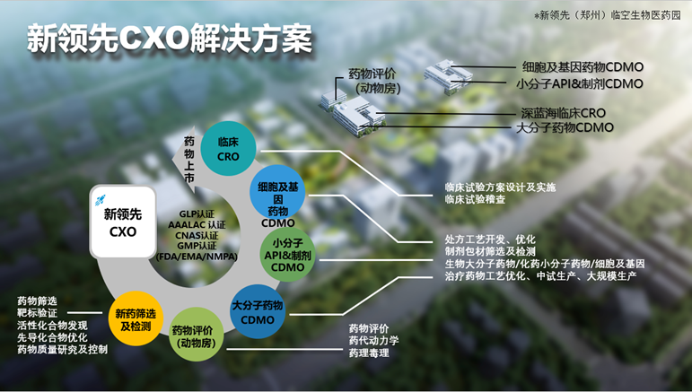 北京新領先公司依托既有的技術和管理團隊,整合鄭州臨空生物醫藥園平臺,全面入資,建設并運營了“新藥篩選及檢測平臺、藥物評價平臺(動物房)、大分子中試及大規模生產服務平臺、小分子CMC制劑研究生產平臺、細胞技術服務平臺、臨床CRO平臺”六大符合國際標準的技術服務平臺,打通醫藥研發上下游產業,新領先CXO體系多維度全方位賦能創新企業突破瓶頸高速成長,推動醫藥行業加速發展。