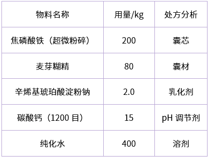 由于焦磷酸鐵在食品營養強化中用途廣用量大,結合工業化方便、經濟的生產實際特點,本人在生產實踐中采用噴霧干燥法,以糖類物質為壁材,采用微膠囊化技術對普通焦磷酸鐵原料進行包埋處理,處理后的焦磷酸鐵性狀呈現小顆粒狀細粉,流散性好,加工性能(混合均勻性)得以提高,同時焦磷酸鐵經過微膠囊化包埋處理,避免了與植物蛋白直接接觸誘發酸敗。