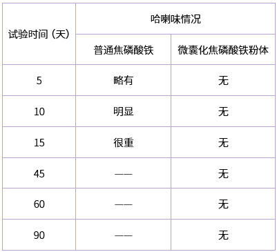 5.將普通的焦磷酸鐵與微囊化焦磷酸鐵粉體分別與豆粉按相同比例進行混合,放在相同條件(恒溫恒濕箱內,設定溫度40℃,濕度70%)下,定期取樣。