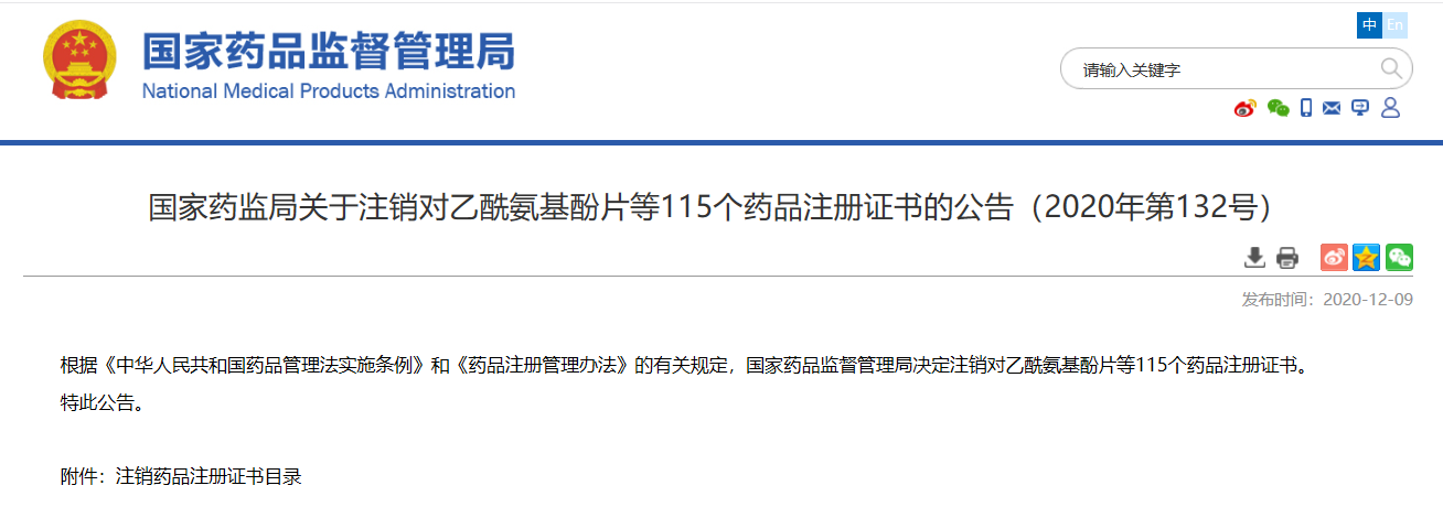 關于注銷對乙酰氨基酚片等115個藥品注冊證書的公告(2020年第132號)