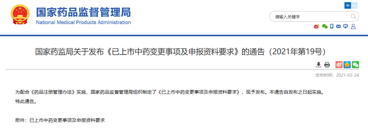 關于發布《已上市中藥變更事項及申報資料要求》的通告(2021年第19號)