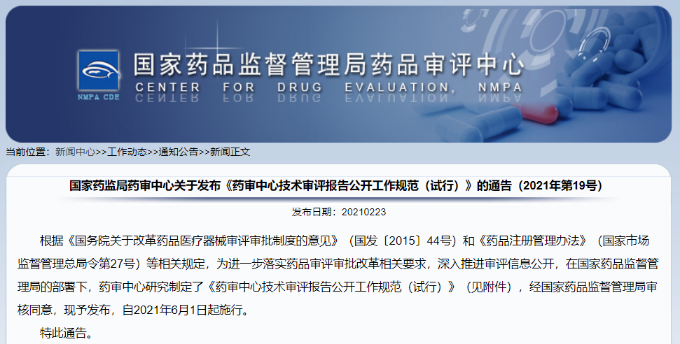 關于發布《藥審中心技術審評報告公開工作規范(試行)》的通告(2021年第19號)