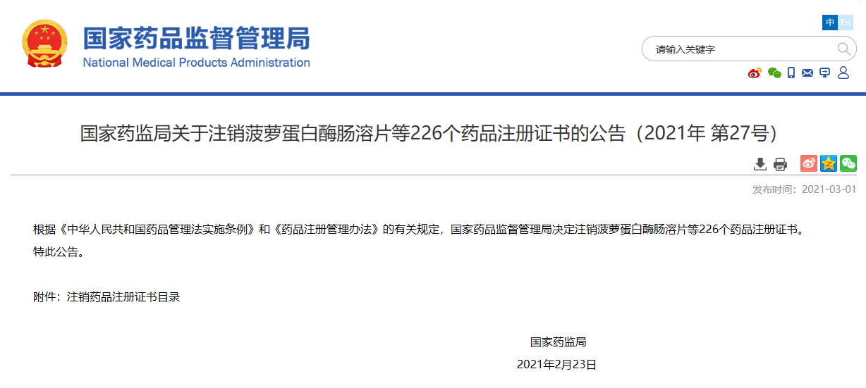 國家藥監局關于注銷菠蘿蛋白酶腸溶片等226個藥品注冊證書的公告(2021年 第27號)