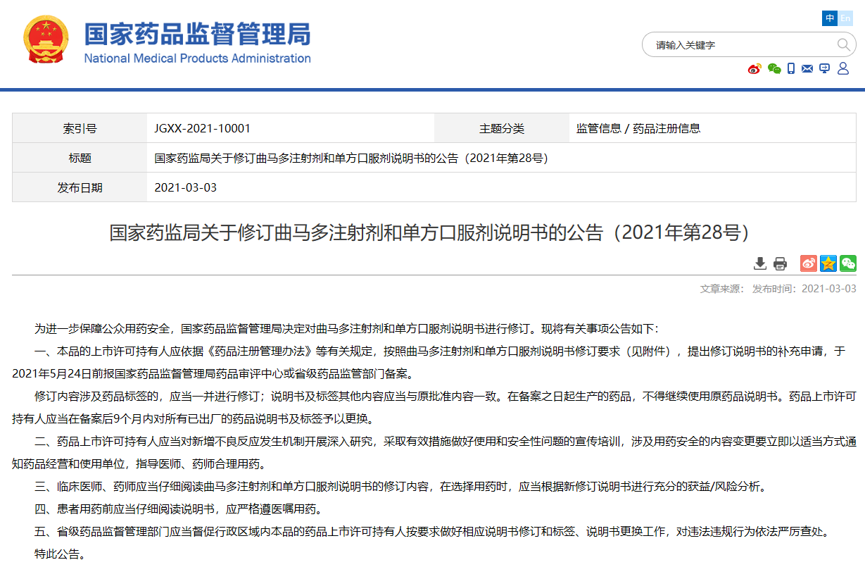 關于修訂曲馬多注射劑和單方口服劑說明書的公告(2021年第28號)