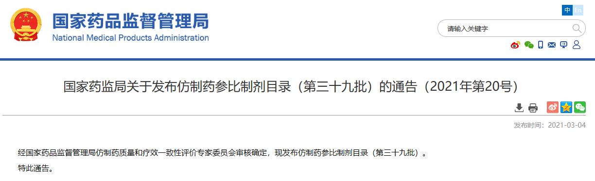 關于發布仿制藥參比制劑目錄(第三十九批)的通告(2021年第20號)