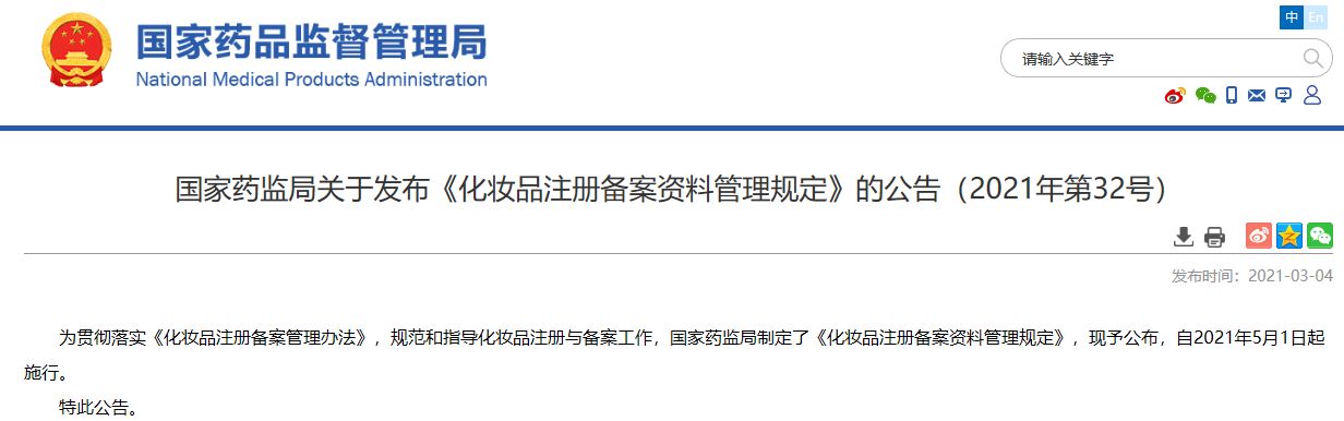 關于發布《化妝品注冊備案資料管理規定》的公告(2021年第32號)