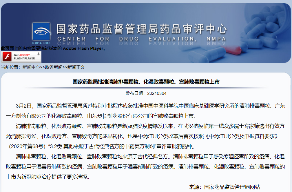 國家藥監局批準清肺排毒顆粒、化濕敗毒顆粒、宣肺敗毒顆粒上市
