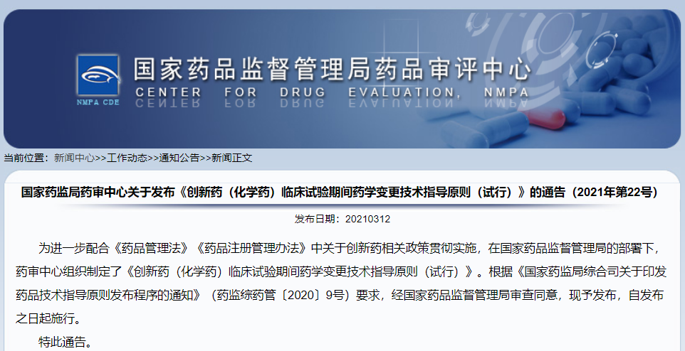 關于發布《創新藥(化學藥)臨床試驗期間藥學變更技術指導原則(試行)》的通告(2021年第22號)