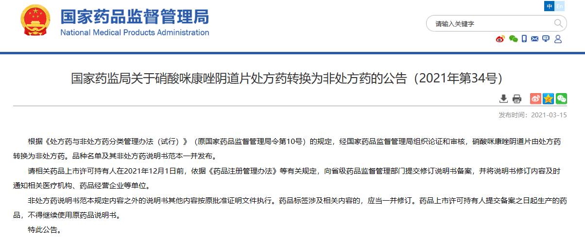 關于硝酸咪康唑陰道片處方藥轉換為非處方藥的公告(2021年第34號)