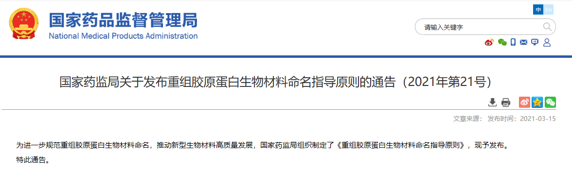 關于發布重組膠原蛋白生物材料命名指導原則的通告(2021年第21號)