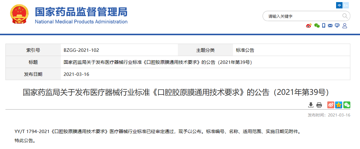 關于發布醫療器械行業標準《口腔膠原膜通用技術要求》的公告(2021年第39號)