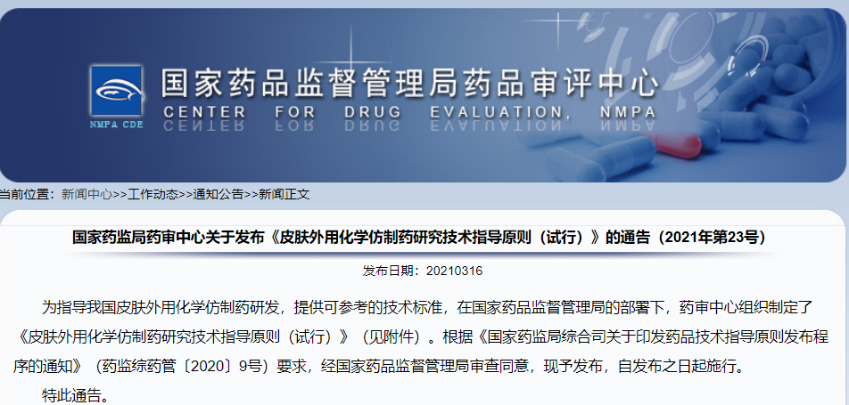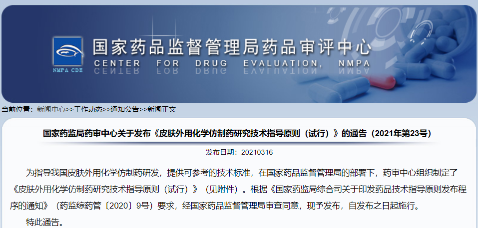 關于發布《皮膚外用化學仿制藥研究技術指導原則(試行)》的通告(2021年第23號)