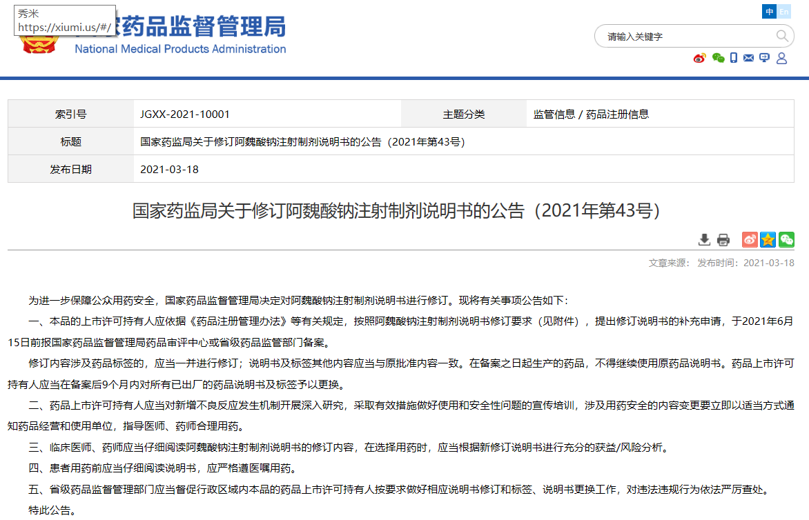 關于修訂阿魏酸鈉注射制劑說明書的公告(2021年第43號)